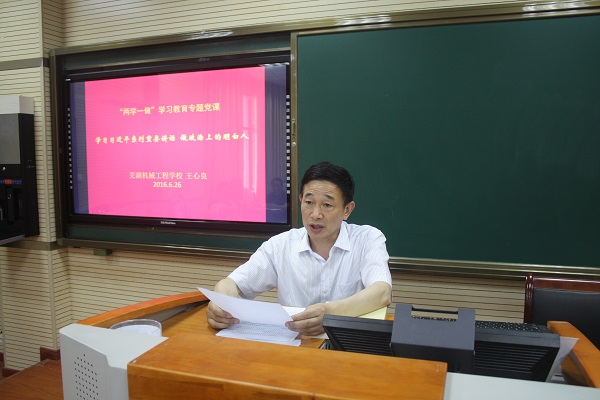 6月26日下午,芜湖机械工程学校党支部在五楼录播教室召开本学期第三次党员大会,由校党支部书记、校长王心良给全体党员上党课。