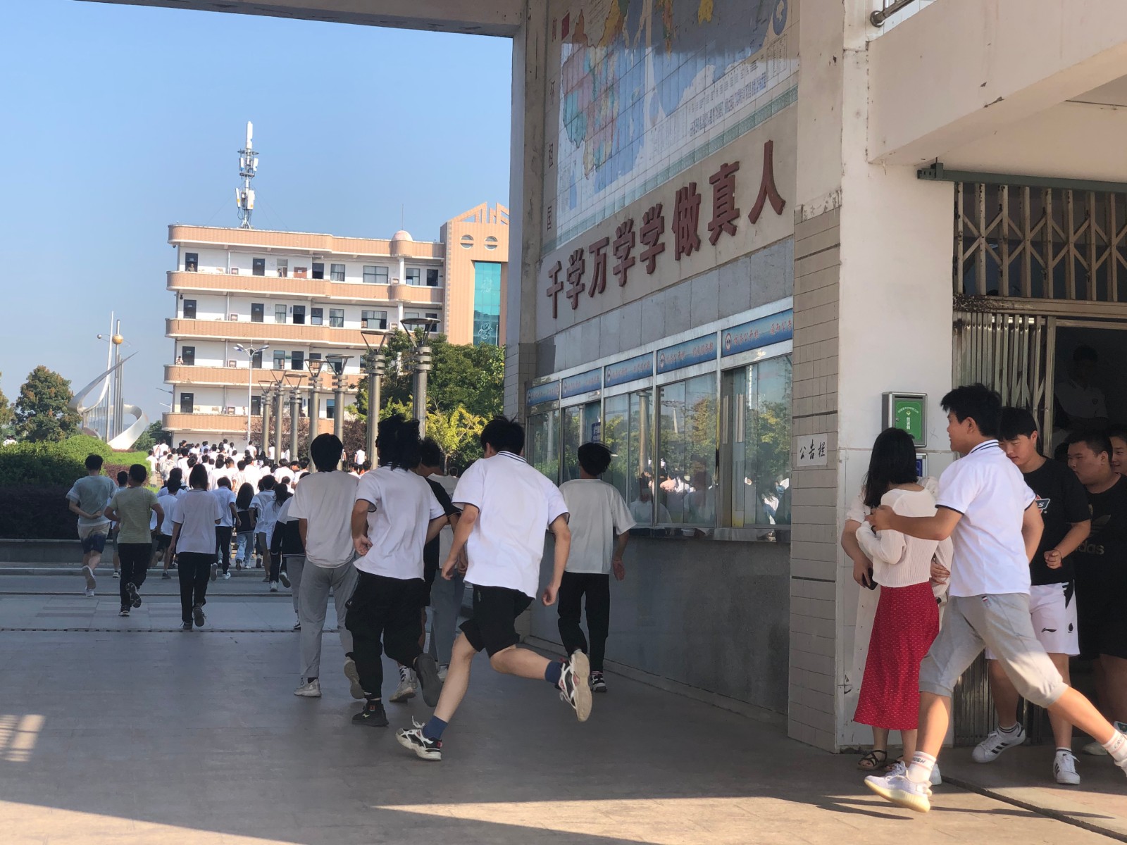 上午8点30分,学校拉响警报声,师生们纷纷低头弯腰快步离开教室、办公室,跑步疏散到学校操场。整个疏散演练过程中,学生抱头快速撤离有序,在较短的时间内全体师生全部撤离教学区。