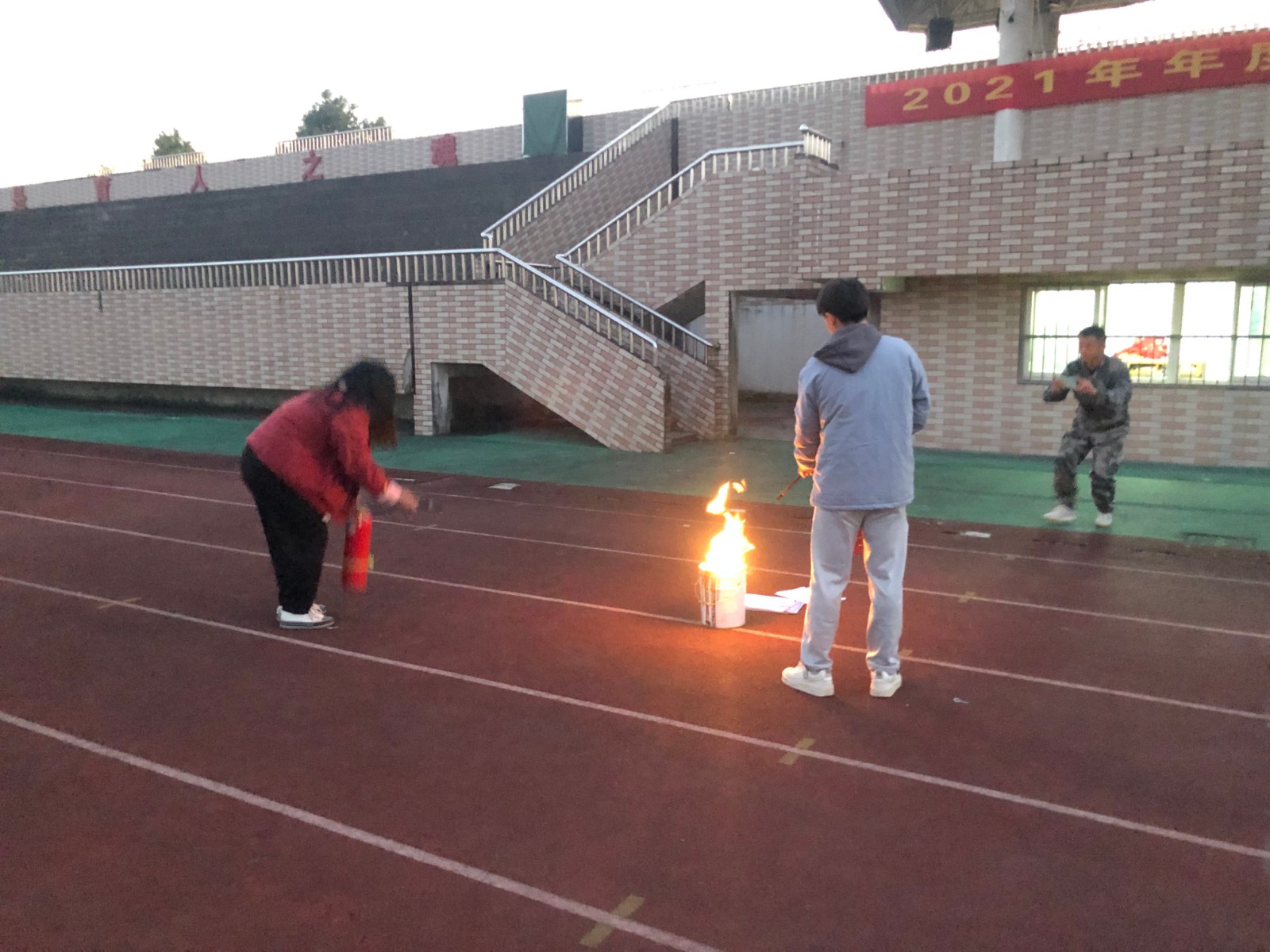 然后,邀请了两名同学生进行了灭火器的实际使用,向全体住校生展示了灭火器灭火的使用方法。